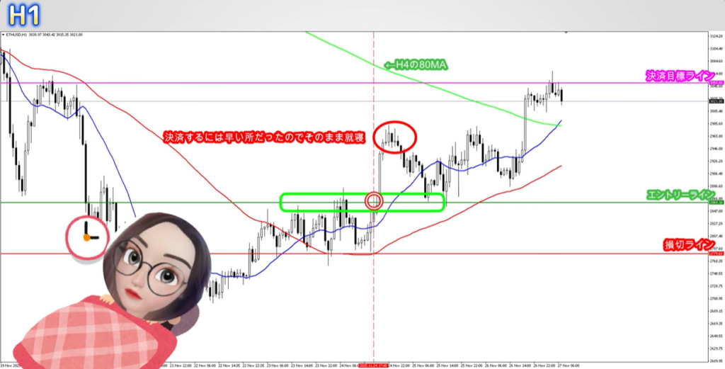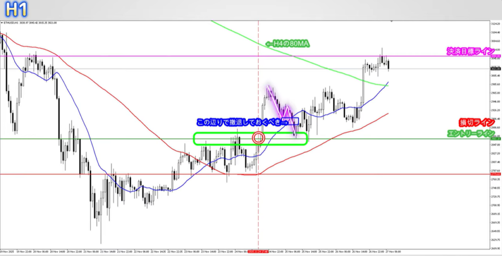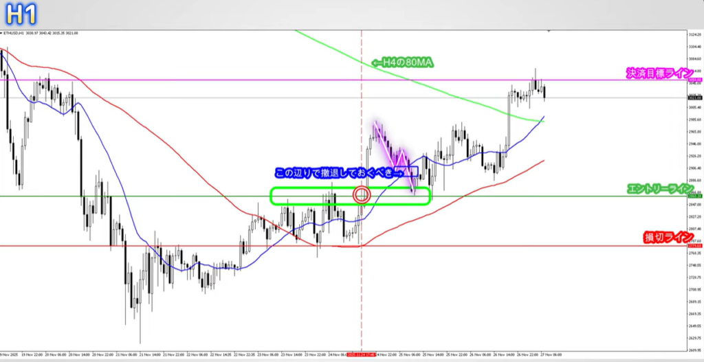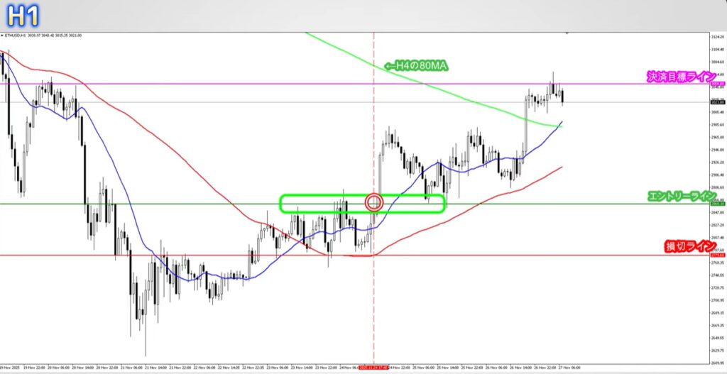 ターゲットは、4時間足の節目ラインと80MAが重なるポイント(ピンク線)。リスクリワードは1:2が取れるため問題なしと判断しました。