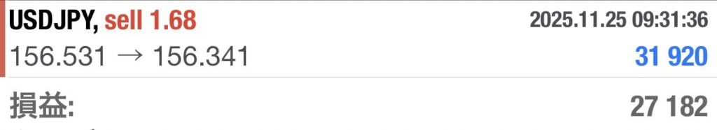 結果、ヒゲでストップにかかり、薄利(スワップ調整後 27,182円)で終了。