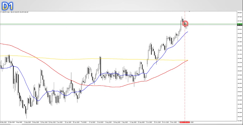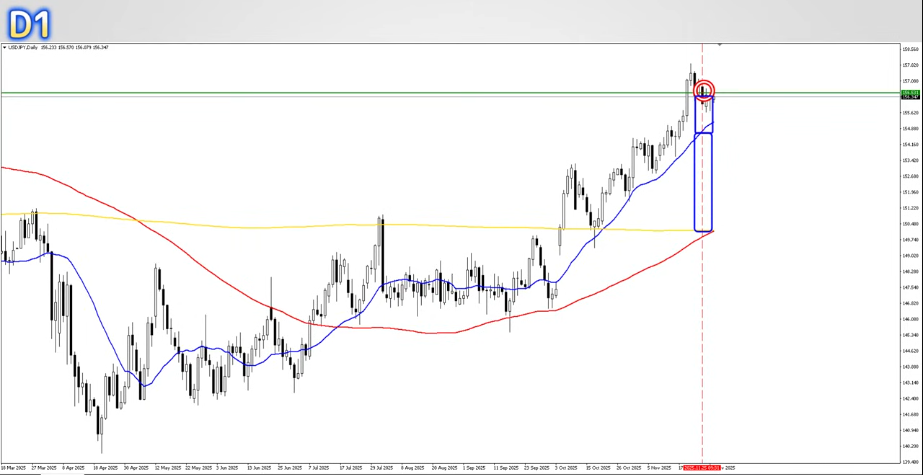 さらに、上方向は黒の水平線(直近押し安値ライン)と青い短期移動平均線にしっかり抑えられています。