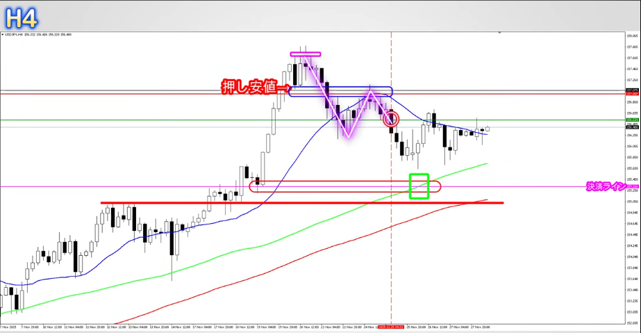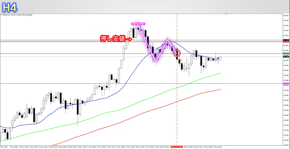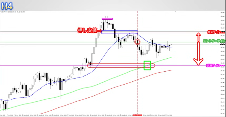 【4時間足】押し安値割れ後の「下降3波」を狙う局面