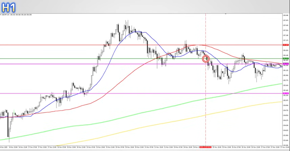 4時間足では、上昇の頂点を付けた後に下降へ転換し、押し安値を明確に割っています。1波・2波と形成し、これから3波目が始まりそうな場面でした。
