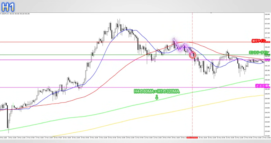 「もっと早く入れたのでは?」と思う人もいるかもしれませんが、その時点では4時間足MAがまだ下向きではありませんでした。