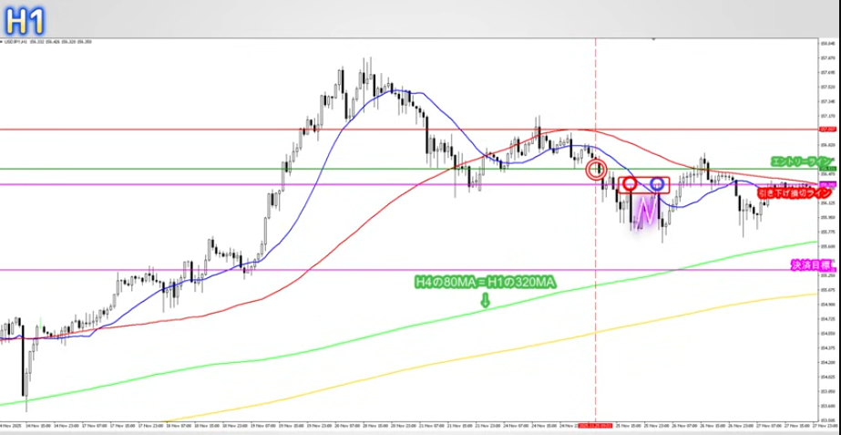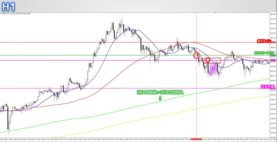 ここまで上位足環境を把握したうえで1時間足でエントリータイミングを計っていきます。